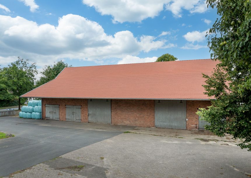 Das Deckbild unserer beliebten Doppelmulde Z2 sieht sehr harmonisch aus und passt aufgrund der traditionellen Anmutung sehr gut zur restaurierten Scheune. Eine so große und schöne Dachfläche sieht man selten! Das Klinker der Fassade ergänzt den Look sehr gut. Den sicheren und ästhetischen Dachabschluss am Frist bildet der beliebte Firstziegel F6v.