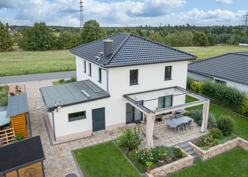 Nicht ohne Grund der meistgewählte Dachziegel von Jacobi: Unser Flachdachziegel J11v. Auf diesem schmucken Neubau strahlt er in edelschwarz – eine unserer Edelengoben, die eine glatte, feine Oberfläche schaffen. Bauherren und Architekten haben bei diesem Modell die Wahl aus 17 Ziegeloberflächen. Eine hilfreiche Orientierung bieten die weit verbreiteten Musterziegelständer im Handwerk und Handel oder unser kostenloser Musterziegelversand. Verpassen Sie nicht die schöne Detailaufnahme des Walms – technisch die regensicherste Variante und optisch ohnehin ein Highlight. Zu modernen, schwarzen Dächern harmonieren zarte Fassadenfarbtöne sehr gut. Dieses Objekt zeigt zudem schöne Gartengestaltungsmöglichkeiten und eine traumhafte Terrasse.