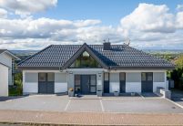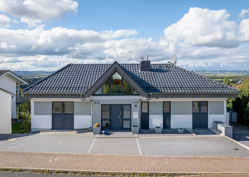 Lavagrau matt aus unseren hochwertigen Glasuren der Collection Avantgarde begeistert durch seine optischen und technischen Vorzüge und erfreut sich großer Beliebtheit. Das typische Walmdach eines Bungalows wird bei dieser Referenz durch eine elegante Satteldachgaube über dem Eingangsbereich harmonisch ergänzt. Auf dem beiliegenden Detailbild können Sie den Firstanfänger für Satteldächer bewundern – ein elegantes Detail, das die Dachgestaltung perfekt abrundet.