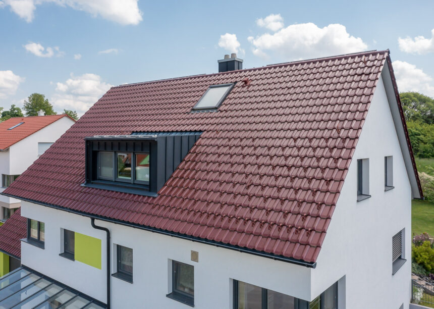 Farbakzente und sehr hochwertiges Dach lassen dieses Einfamilienhaus besonders hochwertig wirken.